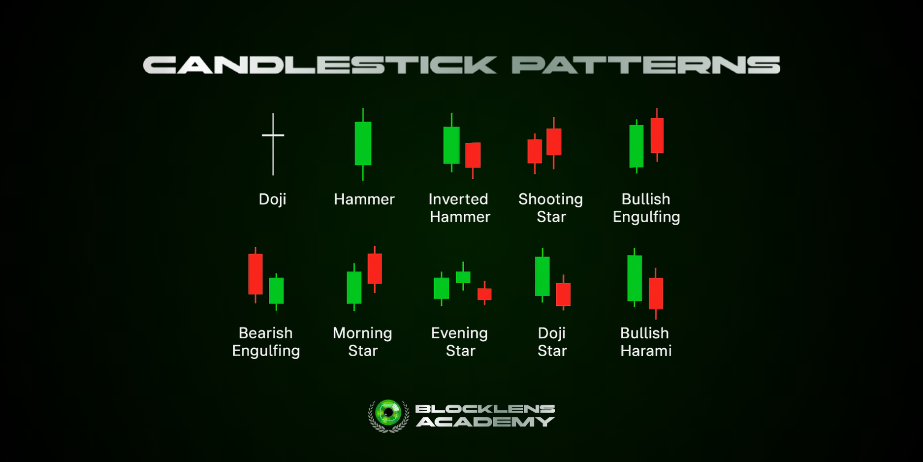 <table data-header-hidden data-full-width="true"><thead><tr><th>Candlestick Pattern</th><th>Type</th><th>Purpose / Signal</th><th>How Blocklens AI Uses It</th></tr></thead><tbody><tr><td><strong>Doji</strong></td><td>Reversal</td><td>Indicates indecision in the market; potential trend reversal</td><td>Confirms reversals when combined with trend indicators (e.g., MA, RSI)</td></tr><tr><td><strong>Hammer</strong></td><td>Bullish Reversal</td><td>Shows strong buying after a downtrend</td><td>Signals potential long entries, especially near support levels</td></tr><tr><td><strong>Inverted Hammer</strong></td><td>Bullish Reversal</td><td>Indicates possible reversal after a downtrend</td><td>Used with other indicators to confirm trend reversal</td></tr><tr><td><strong>Shooting Star</strong></td><td>Bearish Reversal</td><td>Indicates strong selling after an uptrend</td><td>Signals potential short entries near resistance</td></tr><tr><td><strong>Engulfing (Bullish)</strong></td><td>Bullish Reversal</td><td>Larger green candle engulfs previous red candle</td><td>Confirms strong buying momentum; potential long entry</td></tr><tr><td><strong>Engulfing (Bearish)</strong></td><td>Bearish Reversal</td><td>Larger red candle engulfs previous green candle</td><td>Confirms strong selling momentum; potential short entry</td></tr><tr><td><strong>Morning Star</strong></td><td>Bullish Reversal</td><td>Three-candle pattern signaling trend reversal</td><td>Used to confirm long positions after downtrend</td></tr><tr><td><strong>Evening Star</strong></td><td>Bearish Reversal</td><td>Three-candle pattern signaling trend reversal</td><td>Used to confirm short positions after uptrend</td></tr><tr><td><strong>Doji Star</strong></td><td>Neutral / Reversal</td><td>Indicates potential indecision and trend change</td><td>Combined with other signals to avoid false trades</td></tr><tr><td><strong>Harami (Bullish/Bearish)</strong></td><td>Reversal</td><td>Small candle contained within previous candle</td><td>Signals weakening trend; helps AI filter entries and exits</td></tr></tbody></table>